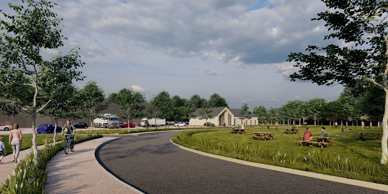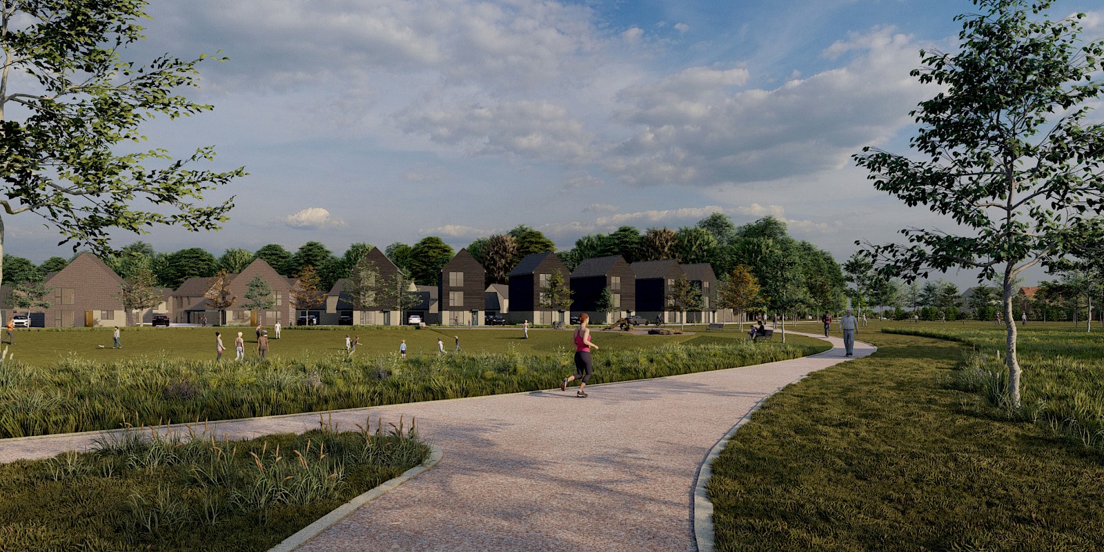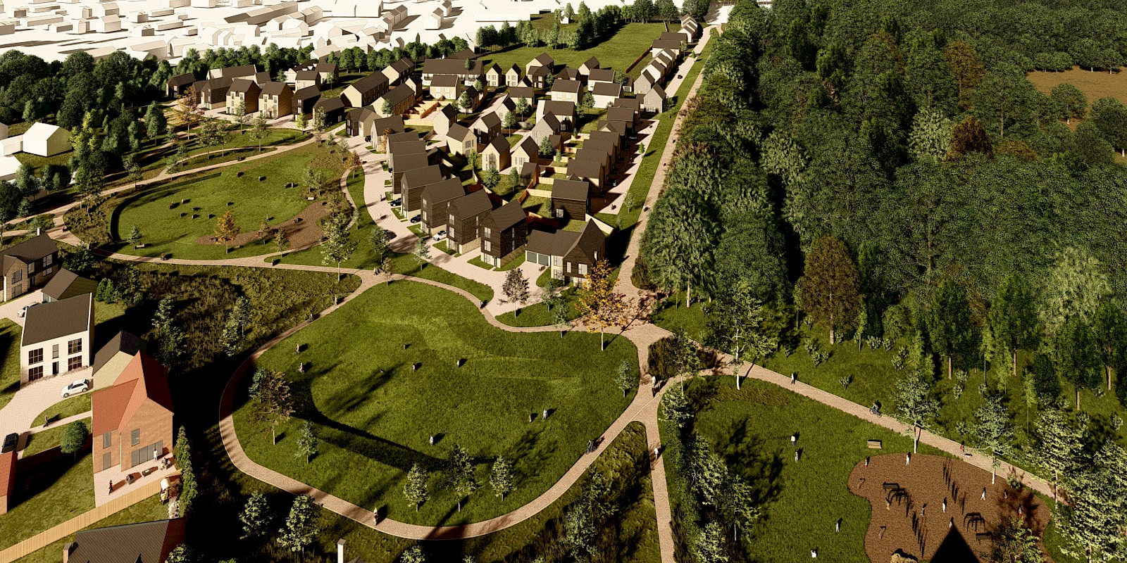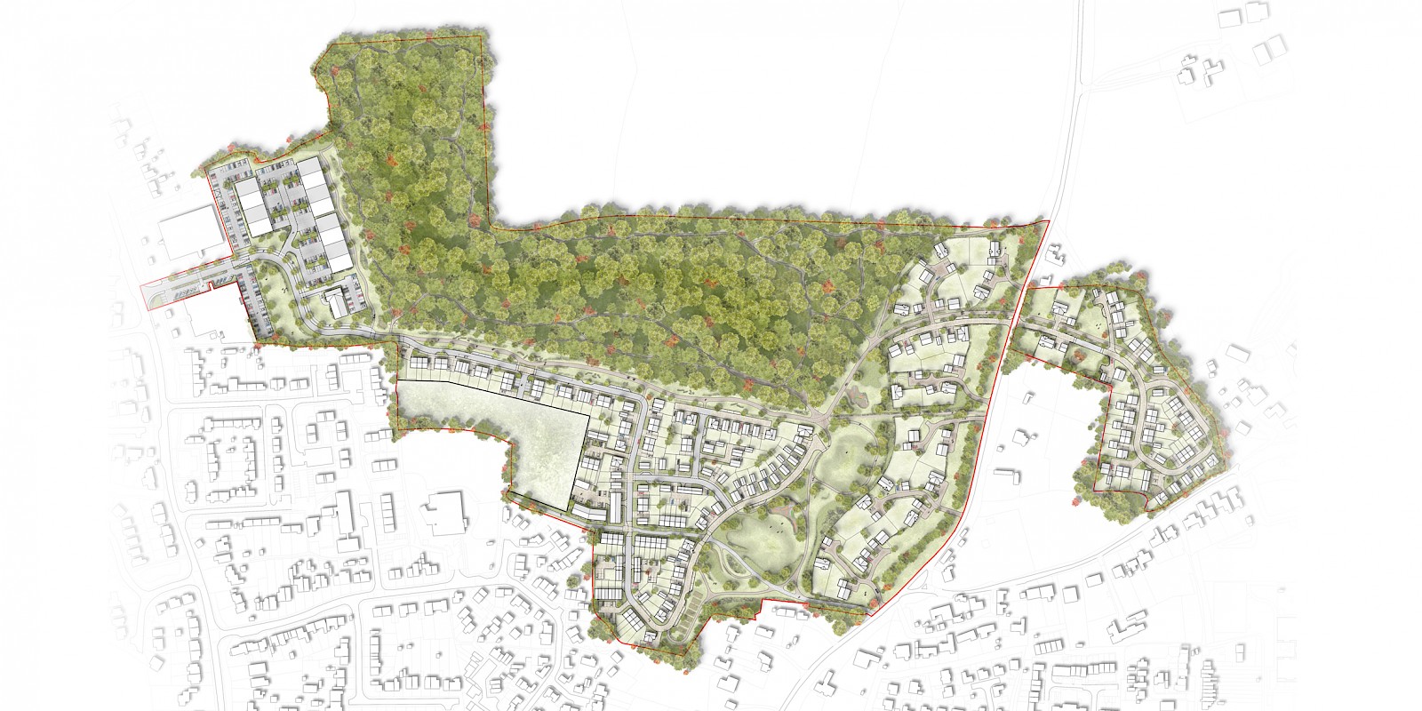 Proposals would provide a mix of high-quality housing, including affordable homes, in a sustainable location to help meet the supply needs of the district. In addition, new commercial space would provide employment opportunities to the locality alongside community benefits with a new medical centre, extension to the school playing field and the Ancient Woodland, areas of public open space and pedestrian and cycle routes.
